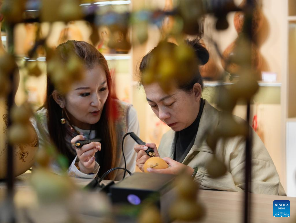 Traditional culture enthusiasts make gourd pyrography works at the Emin County memory museum in Emin County, northwest China’s Xinjiang Uygur Autonomous Region.